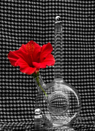 Tag: rosso, fiore, vetro, nero, bianco, trasparente, bottiglia, petali, pistillo, stoffa, sfera, tappo, contrasto, verde, trasparenze, vaso, pistilli.