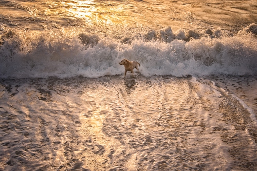 Tag: cane, onda, mare, acqua, onde, animale, tramonto, schiuma, bianco, riflesso, riflessi, muso, spiaggia.
