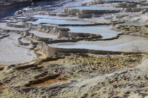 Alcune delle caratteristiche "vasche" formate dalle concrezioni di carbonato di calcio a Pamukkale, in Turchia.