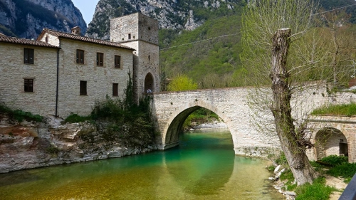 Indubbiamente il punto forte della foto è il colore smeraldo dell'acqua, poi la bella luce sul ponte, poi la torre a sinistra. Non è male anche l'albero spoglio a destra, che insieme con la torre crea una specie di cornice al ponte.