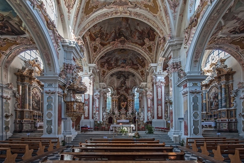 Altri tag (senza riscontro): navata, scanni, panchine, pilastri, arco, dipinti, barocco, prospettiva.