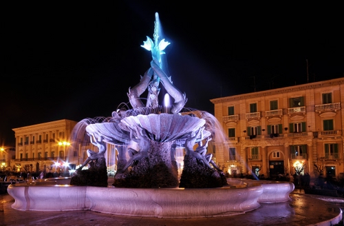 Tag: fontana, acqua, notte, piazza, palazzi, luci, finestre, statue, notturno, balconi, lampioni, viola, spruzzi, conchiglie, zampilli, azzurro.