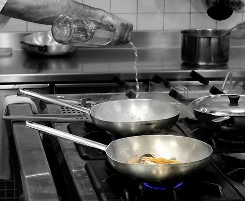 Tag: bottiglia, cucina, padelle, pentole, fornelli, braccio, cibo, gas, olio, fornello, bianconero, cucinare.