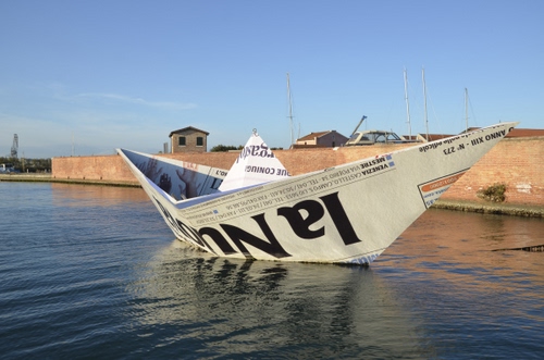 Non è un fotomontaggio: è una scultura al largo dell’Isola di Certosa, nella Laguna di Venezia.