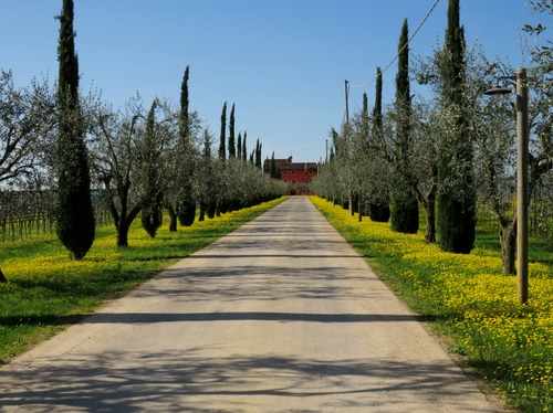 Tag: alberi, verde, fiori, giallo, cipressi, strada, cielo, erba, viale, ombre, ulivi, prospettiva, azzurro, casa, lampione, ombra.