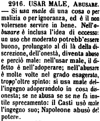 Usar male, Abusare - Si usa male di una cosa o per malizia o per ignoranza, ed è il non volersene servire in bene. Nell'abusare è inclusa l'idea di eccesso: un uso che moderato potrebb'essere buono, prolungato al di là della discrezione, dell'onestà, diventa abuso e perciò male: nell'usar male, il difetto è nell'adoperare; nell'abusare è molte volte nel grado esagerato, tropp'oltre spinto: si usa male dell'ingegno adoperandolo in cosa disonesta; se ne abusa se se ne fa inutile sprecamento: il Casti usò male l'ingegno suo; Napoleone abusò del potere. [immagine]