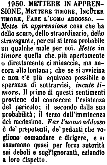 Mettere in apprensione, Mettere timore, Incuter timore, Fare l’uomo addosso - Mette in apprensione cosa che ha dello scuro, dello straordinario, dello stravagante, per cui si tema probabile un qualche male per noi. Mette in timore quella che più apertamente o direttamente ci minaccia, ma ancora alla lontana; che se si avvicina e non c'è più equivoco possibile o speranza di sottrarvisi, incute timore. Il primo di questi sentimenti proviene dal conoscere l'esistenza del pericolo; il secondo dalla sua probabilità; il terzo dall'imminenza del medesimo. Far l'uomo addosso è de' prepotenti, de' pedanti che vogliono comandare e dirigere, e si assumono quasi per forza autorità sui deboli e sugl'ignoranti, eziandio a loro dispetto. [immagine]