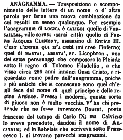 Anagramma - Trasposizione o scomponimento delle lettere di un nome o d'altra parola per farne una nuova combinazione da cui resulti un senso qualunque. Per esempio l'anagramma di logica è caligo; quello di Versailles, ville seras; (sarai città) quello di Frere Jacques Clement, assassino di Enrico III, c'est l'enfer qui m'a créé (mi creò l'inferno) quel di mastai, amistà, ec. Licophron, uno dei sette personaggi che composero la Pleiade sotto il regno di Tolomeo Filadelfio, e che visse circa 280 anni innanzi Gesù Cristo, è riguardato come padre dell'anagramma, poichè i più antichi che si conoscano sono quei ch'egli fece dal nome di quel principe e della regina Arsinoe. Presso i moderni, questa sorta di giuoco non è molto vecchia. V'ha chi pretende che ne fosse inventore Daurat, poeta francese del tempo di Carlo IX; ma Calvino lo aveva preceduto, dandosi il nome di Alcuinus; ed in Rabelais che scriveva sotto Francesco I. si trovano parecchi anagrammi. [immagine]