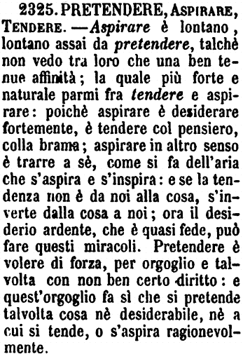 Pretendere, Aspirare, Tendere - Aspirare è lontano, lontano assai da pretendere, talchè non vedo tra loro che una ben tenue affinità; la quale più forte e naturale parmi fra tendere e aspirare: poichè aspirare è desiderare fortemente, è tendere col pensiero, colla brama; aspirare in altro senso è trarre a sè, come si fa dell'aria che s'aspira e s'inspira: e se la tendenza non è da noi alla cosa, s'inverte dalla cosa a noi; ora il desiderio ardente, che è quasi fede, può fare questi miracoli. Pretendere è volere di forza, per orgoglio e talvolta con non ben certo diritto: e quest'orgoglio fa sì che si pretende talvolta cosa nè desiderabile, nè a cui si tende, o s'aspira ragionevolmente. [immagine]