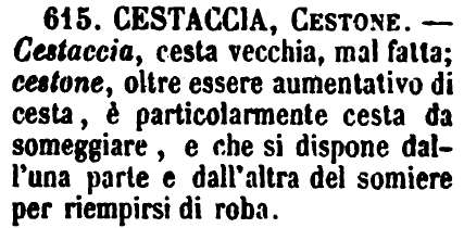 Cestaccia, Cestone - Cestaccia, cesta vecchia, mal fatta; cestone, oltre essere aumentativo di cesta, è particolarmente cesta da someggiare, e che si dispone dall'una parte e dall'altra del somiere per riempirsi di roba. [immagine]