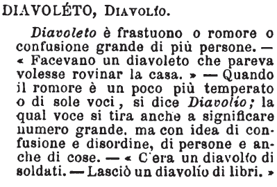 Diavoleto, Diavolio - Diavoleto è frastuono o romore o confusione grande di più persone. - «Facevano un diavoleto che pareva volesse rovinar la casa.» - Quando il romore è un poco più temperato o di sole voci, si dice Diavolío; la qual voce si tira anche a significare numero grande, ma con idea di confusione e disordine, di persone e anche di cose. - «C'era un diavolío di soldati. - Lasciò un diavolío di libri. » [immagine]