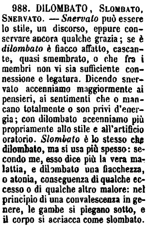 Dilombato, Slombato, Snervato - Dilombato si intende colui che, per debolezza di forze abituale o naturale, non regge a veruno esercizio. - Slombato è quasi accidentale e per più ragioni. - Snervato accenna fiacchezza minore, ma più generale. Tutte e tre si trasportano al figurato e specialmente allo stile: e Snervato è allora quello stile a cui manca la efficacia e la forza, ma non è al tutto vizioso: Dilombato è quando gli manca quasi ogni pregio di grazia e di colorito: Slombato è l'assoluta mancanza di forza, di grazia e di colorito. [immagine]