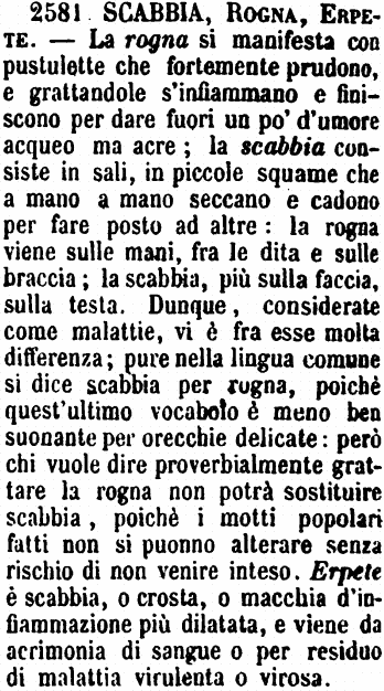 Scabbia, Rogna, Erpete - La rogna si manifesta con pustulette che fortemente prudono, e grattandole s'infiammano e finiscono per dare fuori un po' d'umore acqueo ma acre; la scabbia consiste in sali, in piccole squame che a mano a mano seccano e cadono per fare posto ad altre: la rogna viene sulle mani, fra le dita e sulla faccia; la scabbia, più sulla faccia, sulla testa. Dunque, considerate come malattie, vi è fra esse molta differenza; pure nella lingua comune si dice scabbia per rogna, poichè quest'ultimo vocabolo è meno ben suonante per orecchie delicate: però chi vuole dire proverbialmente grattare la rogna non potrà sostituire scabbia, poichè i motti popolari fatti non si puonno alterare senza rischio di non venire inteso. Erpete è scabbia, o crosta, o macchia d'infiammazione più dilatata, e viene da acrimonia di sangue o per residuo di malattia virulenta o virosa. [immagine]