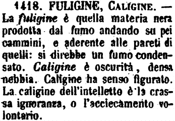 Fuligine, Caligine - La fuligine è quella materia nera prodotta dal fumo andando su pei cammini, e aderente alle pareti di quelli: si direbbe un fumo condensato. Caligine è oscurità, densa nebbia. Caligine ha senso figurato. La caligine dell'intelletto è la crassa ignoranza, o l'acciecamento volontario. [immagine]