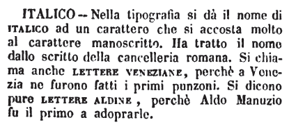| Italico - Nella tipografia si da il nome di italico ad un carattere che si accosta molto al carattere manoscritto. Ha tratto il nome dallo scritto della cancelleria romana. Si chiama anche lettere veneziane, perchè a Venezia ne furono fatti i primi punzoni. Si dicono pure lettere aldine, perchè Aldo Manuzio fu il primo a adoprarle. [immagine] |