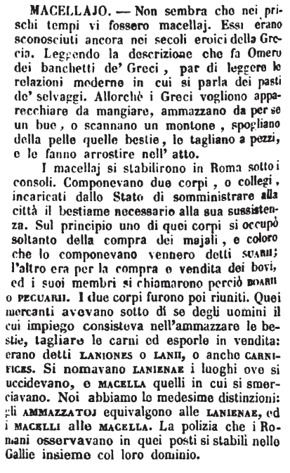 I macellaj si stabilirono in Roma sotto i consoli. Componevano due corpi, o collegi, incaricati dallo Stato di somministrare alla città il bestiame necessario alla sua sussistenza. Sul principio uno di quei corpi si occupò soltanto della compra dei majali, e coloro che lo componevano vennero detti suarii; l'altro era per la compra o vendita dei bovi, ed i suoi membri si chiamarono perciò boarii o pecuarii. I due corpi furono poi riuniti. Quei mercanti avevano sotto di se degli uomini il cui impiego consisteva nell'ammazzare le bestie, tagliare le carni ed esporle in vendita: erano detti laniones o lanii, o anche carnifices. Si nomavano lanienae i luoghi ove si uccidevano, e macella quelli in cui si smerciavano. Noi abbiamo le medesime distinzioni: gli ammazzatoj equivalgono alle lanienae, ed i macelli alle macella. La polizia che i Romani osservavano in quei posti si stabilì nelle Gallie insieme col loro dominio. [immagine] |
