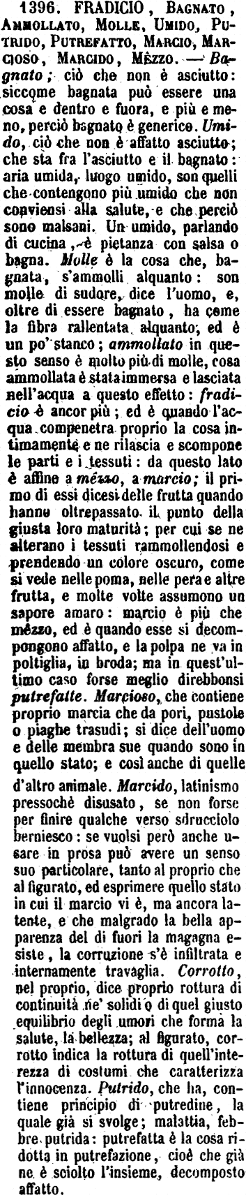 | Fradicio, Bagnato, Ammollato, Molle, Umido, Putrido, Putrefatto, Marcio, Marcioso, Marcido, Mezzo - Bagnato; ciò che non è asciutto: siccome bagnata può essere una cosa e dentro e fuora, e più e meno, perciò bagnato è generico. Umido, ciò che non è affatto asciutto; che sta fra l'asciutto e il bagnato: aria umida, luogo umido, son quelli che contengono più umido che non conviensi alla salute, e che perciò sono malsani. Un umido, parlando di cucina, è pietanza con salsa o bagna. Molle è la cosa che, bagnata, s'ammolli alquanto: son molle di sudore, dice l'uomo, e, oltre di essere bagnato, ha come la fibra rallentata alquanto, ed è un po' stanco; ammollato in questo senso è molto più di molle, cosa ammollata è stata immersa e lasciata nell'acqua a questo effetto: fradicio è ancor più; ed è quando l'acqua compenetra proprio la cosa intimamente e ne rilascia e scompone le parti e i tessuti: da questo lato è affine a mezzo, a marcio; il primo di essi dicesi delle frutta quando hanno oltrepassato il punto della giusta loro maturità; per cui se ne alterano i tessuti rammollendosi e prendendo un colore oscuro, come si vede nelle poma, nelle pera e altre frutta, e molte volte assumono un sapore amaro: marcio è più che mezzo, ed è quando esse si decompongono affatto, e la polpa ne va in poltiglia, in broda; ma in quest'ultimo caso forse meglio direbbonsi putrefatte. Marcioso, che contiene proprio marcia che da pori, pustole o piaghe trasudi; si dice dell'uomo e delle membra sue quando sono in quello stato; e così anche di quelle d'altro animale. Marcido, latinismo pressochè disusato, se non forse per finire qualche verso sdrucciolo berniesco: se vuolsi però anche usare in prosa può avere un senso suo particolare, tanto al proprio che al figurato, ed esprimere quello stato in cui il marcio vi è, ma ancora latente, e che malgrado la bella apparenza del di fuori la magagna esiste, la corruzione s'è infiltrata e internamente travaglia. Corrotto, nel proprio, dice proprio rottura di continuità ne' solidi o di quel giusto equilibrio degli umori che forma la salute, la bellezza; al figurato, corrotto indica la rottura di quell'interezza di costumi che caratterizza l'innocenza. Putrido, che ha, contiene principio di putredine, la quale già si svolge; malattia, febbre putrida: putrefatta è la cosa ridotta in putrefazione, cioè che già ne è sciolto l'insieme, decomposto affatto. [immagine] |
