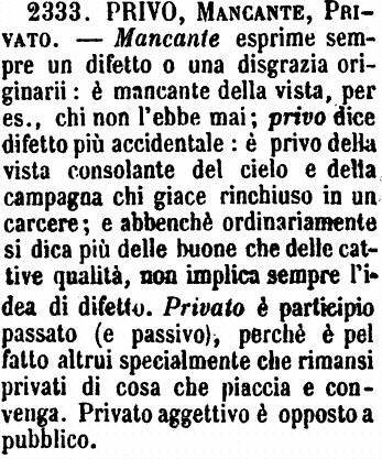 | Privo, Mancante, Privato - Mancante esprime sempre un difetto o una disgrazia originarii: è mancante della vista, per es., chi non l'ebbe mai; privo dice difetto più accidentale: è privo della vista consolante del cielo e della campagna chi giace rinchiuso in un carcere; e abbenchè ordinariamente si dica più delle buone che delle cattive qualità, non implica sempre l'idea di difetto. Privato è participio passato (e passivo), perchè è pel fatto altrui specialmente che rimansi privati di cosa che piaccia e convenga. Privato aggettivo è opposto a pubblico. [immagine] |