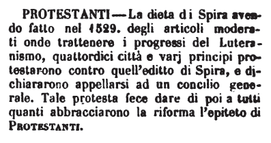 | Protestanti - La dieta di Spira avendo fatto nel 1529. degli articoli moderati onde trattenere i progressi del Luteranismo, quattordici città e varj principi protestarono contro quell'editto di Spira, e dichiararono appellarsi ad un concilio generale. Tale protesta fece dare di poi a tutti quanti abbracciarono la riforma l'epiteto di Protestanti. [immagine] |