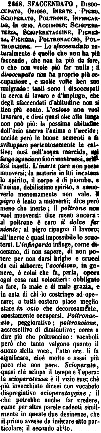 Sfaccendato, Disoccupato, Ozioso, Inerte, Pigro, Scioperato, Poltrone, Infingardo, In ozio, Accidioso; Scioperatezza, Scioperataggine, Pigrezza, Pigrizia, Poltronaccio, Poltroncione - Lo sfaccendato naturalmente è quello che non ha più faccende, che non ha più da fare, o che non vuole più far nulla; il disoccupato non ha proprio più occupazione, e molte volte ben suo malgrado: tanti sono i disoccupati in cerca di lavoro e d'impiego, che degli sfaccendati d'abitudine non si tien più conto. L'ozioso non vuol lavorare, e direi quasi che alla lunga non può più: la pessima abitudine dell'ozio snerva l'anima e l'uccide; uccide però le buone sementi e fa sviluppare portentosamente le cattive; così nell'acqua marcida, nel fango sgusciano fuori mostruosi, schifosi insetti. L'inerte pare non possa muoversi; la materia in lui incatena lo spirito, il corpo è di piombo, e l'anima, debilissimo spirito, a smuoverlo menomamente non vale. Il pigro è lento a muoversi; dice però meno che inerte; il poltrone non vuol muoversi: dice meno ancora: al poltrone è caro il dolce far niente; al pigro ripugna il lavoro; all'inerte è quasi impossibile lo scuotersi. L'infingardo infinge, come dicemmo, di non sapere, di non potere per non darsi brighe e crucci da cui abborre; l'accidioso, in genere, è colui che fa, parla, opera ogni cosa mal volentieri: obbligato a fare, fa male e di mala grazia, e in onta di chi lo costringe ad operare; a tutti costoro piace meglio stare in ozio che decorosamente, onestamente occuparsi. Poltronaccio, peggiorativo; poltroncione, accrescitivo di diminutivo; come a dire più che poltroncino: vocaboli però che tanto valgono quanto il suono della voce, l'atto ecc. li fa significare, cioè molto o assai più poco che non pare. Scioperato, quasi chi sciupa il tempo e l'opera: la scioperatezza è il vizio suo; chè più invecchiato dicesi con vocabolo dispregiativo scioperataggine; il che potrebbe anche far credere, come per altre parole cadenti similmente in queste due desinenze, che il primo avesse da indicare atto particolare; il secondo abito. [immagine]